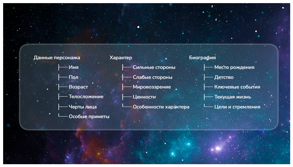 >>853572 Персонаж создаётся поэтапно, через регистрацию по схеме из картинки. Начиная с характера, там ра каждый подраздел даётся по 4к знаков, так что разгоняться можно. Перса сделать можно только человекоподоюного, поскольку в лоре не существует живых инопланетян или магии.