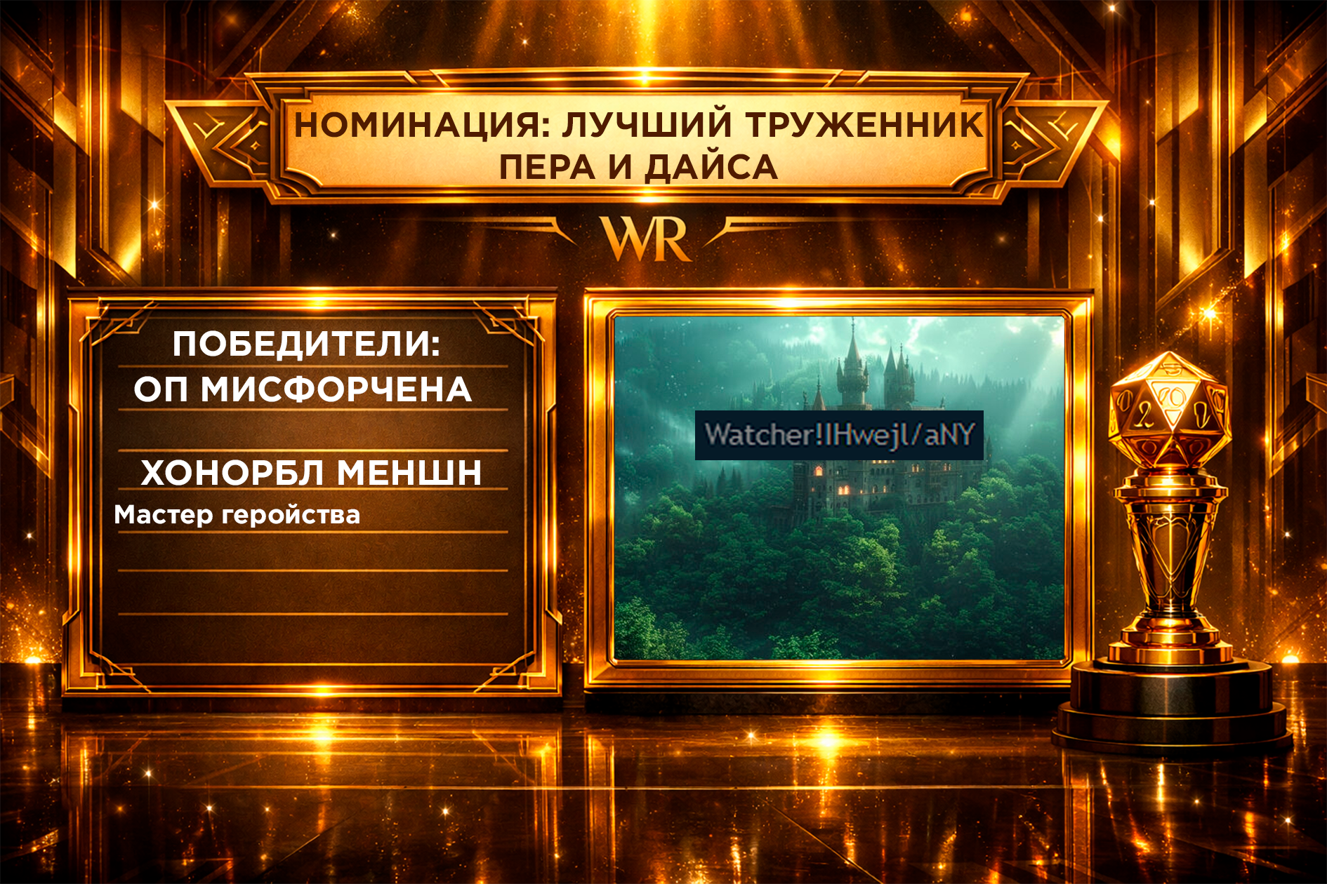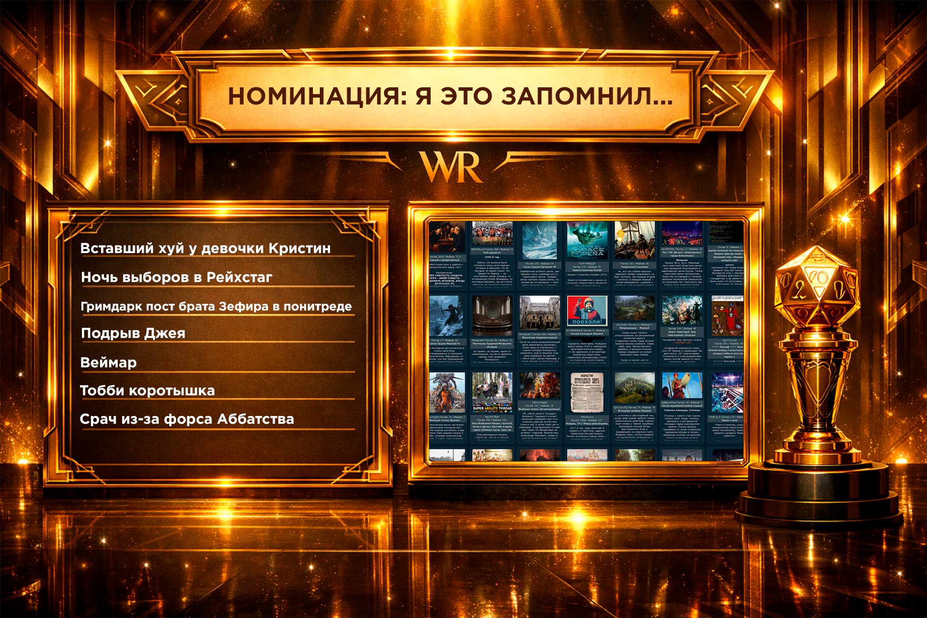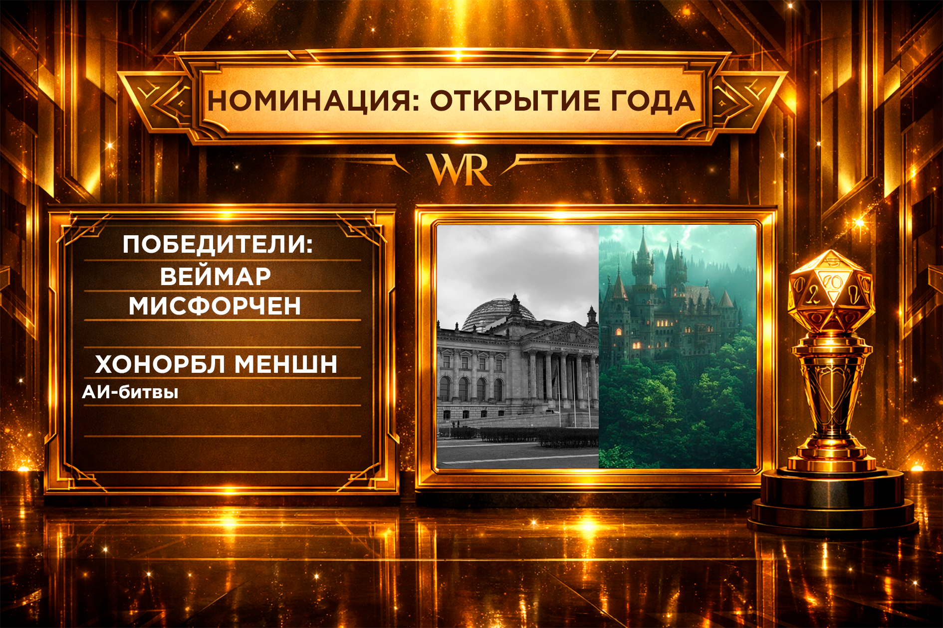 НОМИНАЦИЯ: ОТКРЫТИЕ ГОДА Неожиданная находка года - новая система, кампания или идея, от которой никто ничего не ждал, а зря. Игра, которая приятно (или не очень) удивила и оставила свой след. ПОБЕДИТЕЛЬ: ВЕЙМАР, МИСФОРЧЕН Комментарий ведущего: аналогично, голоса распределились поровну между двумя играми. Будем считать - что Веймар - действительно открывший полу-жанр игр тайл, а Мисфорчен - качественная и хорошая игра, аж настолько, что стала открытием для WR. Думайте.