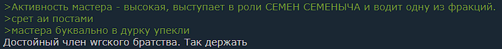 >>869513 >а отписалось полтора графа Нас немного, на самом деле. В голосовании приняло участие 10 графов. Ну даже с учетом максимально оптимистичного экстраполирования (кто-то не проголосовал/забил, кто-то в обсуждач просто не заходит), нас тут 20-25. >Что за Джей и на чем он подорвался Это мастер, давно его не видел тут. Где он в 25 году подрывался - для меня загадка. >Кто такой N? Старожил старого WR-а конца 10х, еще из тусовки Шани, Моринта, Пинки - вы их не знаете, так как наврятли сидели тут, как я, в столь давние времена, когда на всю доску была ровно одна игра - бесконечный понитред. Так вот, N - ведущий отличной КЦИ "Эльфийское королевство приморья", которое жило 10 лет и закончилось, если мне память не изменяет, где-то в перед или в ковидные годы. >Что успел сделать Мортак за 20 постов Буквально ничего, но амплуа самоуверенного орка-страшекурсника, ГИГАЧАДА-альфача с ПАПИНЫМИ связями и снисходительным тоном было прекрасным отыгрышем.