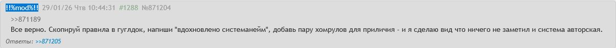>871204 >Скопируй правила в гуглдок, напиши "вдохновлено системанейм", добавь пару хомрулов для приличия - и я сделаю вид что ничего не заметил и система авторская. Это все условия или было что-то еще?