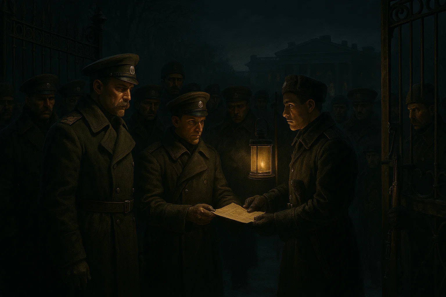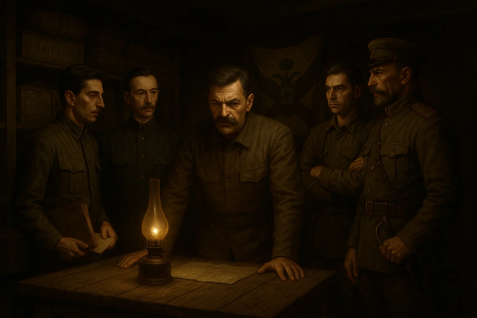 Воздух в комнате стал тяжелее, будто стены приблизились. Голос Дорошенко ударил по тишине низко и властно: — «Довольно. Все слова ваши истинны. Но цель наша едина и нерушима: освободить Николая II и Его Семью изъ узъ Царскаго Села. Сіе есть не только долгъ, но и спасеніе Россіи. Всё иное, что нынѣ зовётся Россіей, — фарсъ и гниль».
