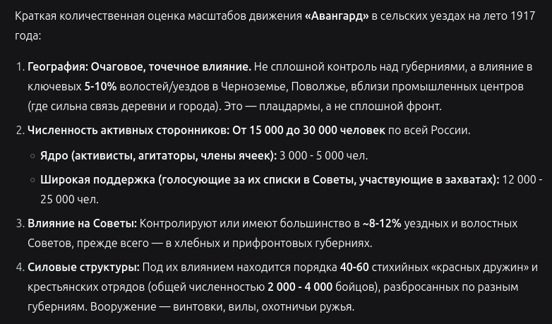 Ресурсы и силовые структуры крайне слабы. "Плохо обученные и вооруженные отряды милиции" — это не армия для восстания. Это скорее отряды самообороны, которые будут беспомощны против регулярных воинских частей, сохраняющих верность Временному правительству, или против хорошо организованных большевистских красногвардейцев осенью 1917-го.
