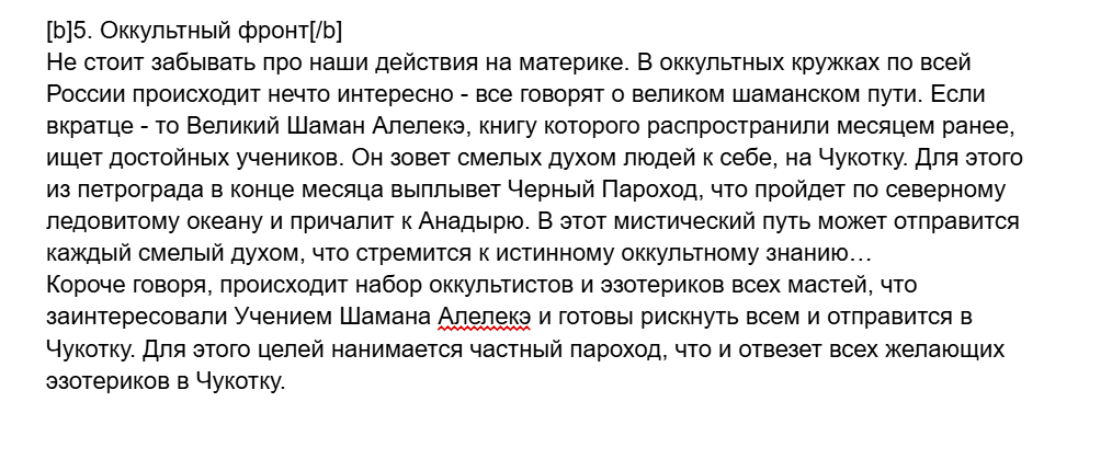 Организационная структура и ресурсы. 1. Лидер - Алелекэ Тынэвири. Чукча с крайне необычной судьбой. Его родители рано умерли и Алелекэ приютили в небольшом русском поселении Анадырь. Там, при православной церкви, он выучил грамоту. В одну из ночей с юношей произошла беда - у него началась страшная болезнь. Несколько недель он лихорадил. И пока со стороны это выглядело как бредни больнго, Алелекэ на самом деле спустился в нижний мир и завоевал там шаманский дар. По итогу он встретился с Великим Вороном, что даровал ему силы шамана и сказал отправляться за моря и найти там себе учителя. Вскоре молодой чукча устроился работать на торговый корабль, что торговал с США. Именно тогда, в конце 19 века, торговля между северными регионами Российской Империи и США набирала обороты. Скопив небольшие сбережения, в очередной раз, когда судно прибыло к американскому порту, Алелекэ сбежал с корабля. Началась трудная жизнь, без документов и знания языка Алелекэ было тяжело, но он преодел многие километры и оказался в Нью-Йорке. Некое потустороннее чувство вело его на восток. Вскоре он нашел свою нишу среди немногочисленных русских эмигрантов - он помогал людям с помощью своего дара, излечивал душевые и физические болезни, предсказывал судьбу. Именно там судьба свела его со своим учителем - Еленой Блаватской, что посвятила его в теософию и восточную эзотерику. А он рассказал ей о шаманском даре и чукотских магических практиках. Вскоре, через связи Блаватской, Алелекэ получает документы и начинает собирать вокруг себя людей, что интересуются шаманизмом. Он учит английский язык и получает определенную известной в эзотерических кругах. Часть заработанных денег он шлет на родину, устанавливая контакты с главами чукотских общин и другими шаманами. Вместе с Блаватской он посещает Индию и Европу. Увы, вскоре блаватская умирает и пути у шамана и теософов расходятся. Алелэке основывает собственный культ, ставя во главу угла чукотскую мифологию. В начале уже этого десятилетия Алелекэ знакомится с Алистером Кроули и идеями Телемы, но все же предпочитает собственную эзотерическую доктрину. Кроме этого, путишествую по Европе, он встречается с рядом левых эмигрантов, в том числе ему получается попить чая вместе с Лениным. Последние несколько лет Алалекэ проводит в Нью-Йорке, в окружении своих последователей, создавая ряд рукописей, где описана доктрина и идеи чукотского шамана. Марксизм, социализм, шаманизм, чукотские традиционные верования, буддизм, теософия и телема синтезируются в единое революционно-эзотерическое учение, что провозглашает своей целью не освобождение трудящихся от оков буржуев, а освобождение мыслящих от оков бытия. Алелекэ приравняет понятие коммунизма к понятию нирваны и верхнего мира. По итогу, после Февральской Революции, Алелекэ собирает наиболее верных последователей, покупает на сбережения корабль, оружия(благо в США с этим проблем нет) и выплывает в Чукотку. Основной груз он доставляет по факту контрабандой, благо в стране хаос и контроля на крайнем севере практически нет. На берегу его уже ждут - он и до этого поддерживал некую связь с шаманами и присылал местным общинам деньги. Сможет ли теперь он объединить коренные народы и поднять их на борьбу? 2. Пока, как таковой струтуры нет. Есть ядро американских учеников Алелекэ и ряд л