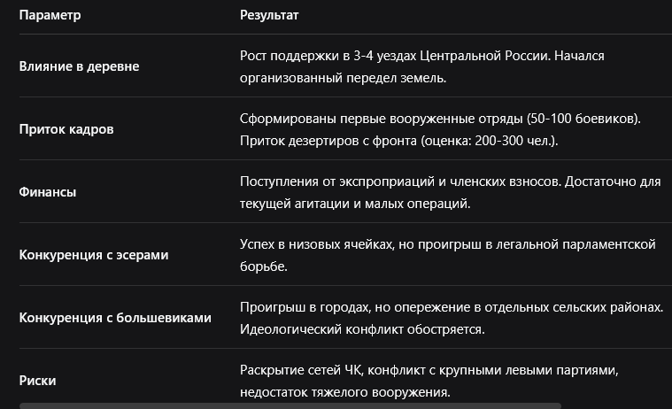 НЕМЕДЛЕННЫЕ РЕАКЦИИ НЕИГРОВЫХ СИЛ Германия: Раздражение. Успехи ССД заставляют Берлин увеличивать поддержку НА, чтобы не дать Петрограду перехватить инициативу. Антанта (Великобритания, Франция): Выжидательный интерес. Увидев признаки жизнеспособности ССД, Лондон и Париж начинают негласные консультации о возможных ограниченных поставках, но официального признания не последует. Казачество: Раскол. Успехи ССД и щедрые фонды Хитрово склоняют часть атаманов к более тесному сотрудничеству с Петроградом. Япония: Ускорение. Появление лояльного Империи генерала на Дальнем Востоке заставляет Токио действовать быстрее, чтобы не упустить инициативу.