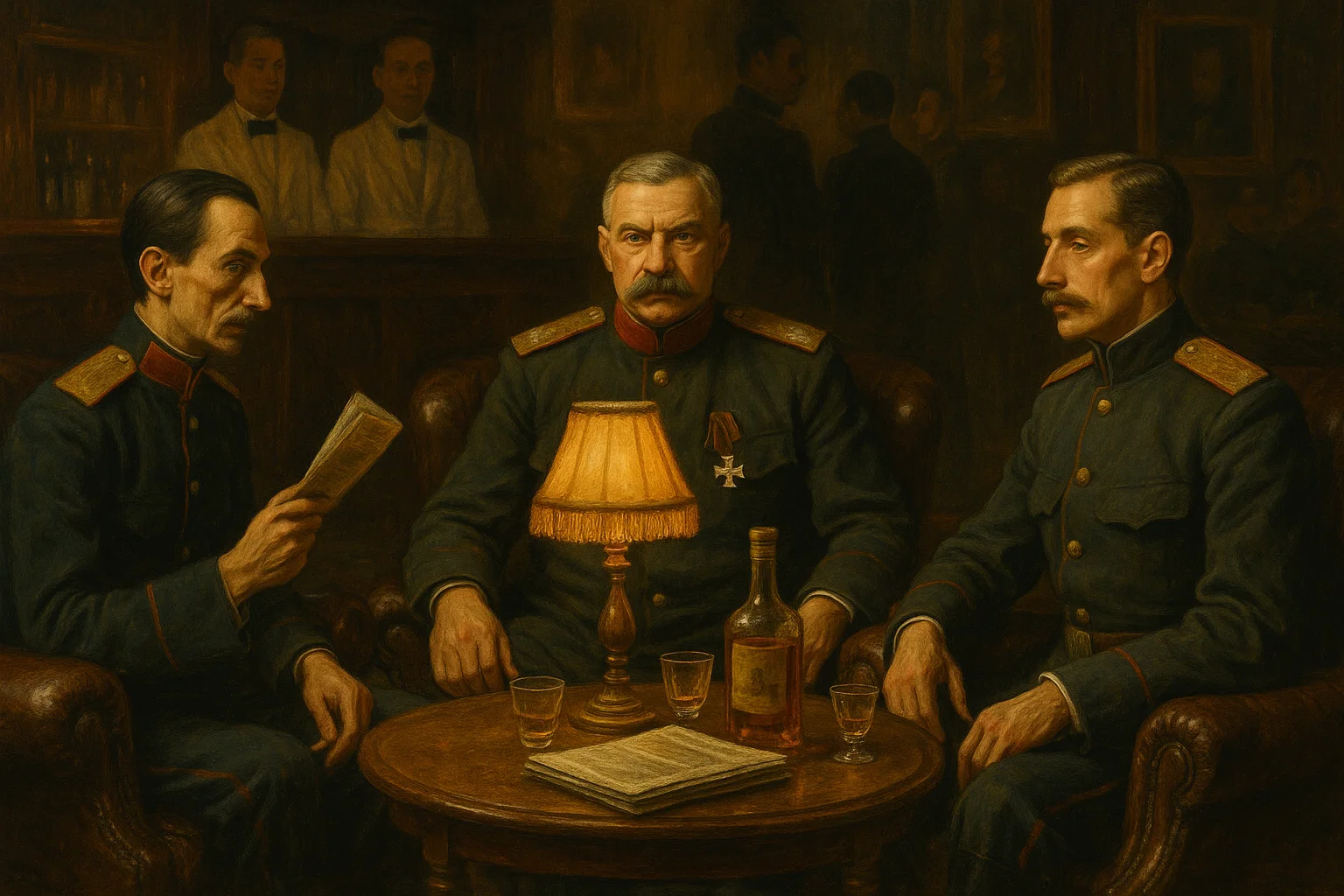 Капитан Михаил Крестьянинов вскинулся, кулак его с гулом опустился на стол: — «Господа! Всякая минута промедленія есть измѣна престолу! Солдатъ ждётъ слова яснаго и прямого: Государь живъ, но въ Царскомъ Селѣ держатъ Его подъ стражей, яко преступника! Мы должны вызволить Его, аще медлимъ — душа солдатская падётъ въ бездну».