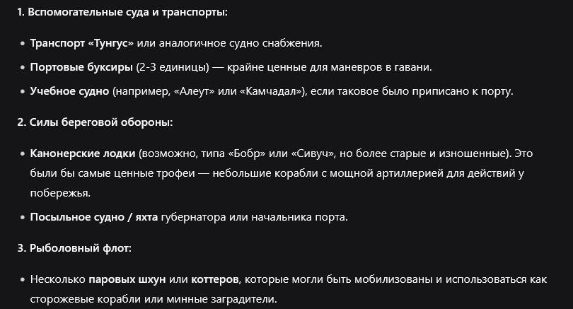 УТОЧНЕНИЯ ПО ВОПРОСАМ ИГРОКА Бронепоезд: Да, к концу сентября создан ОДИН импровизированный бронепоезд, «Сибирский Медведь». Это паровоз, защищённый стальными листами и мешками с песком, с установленными пулемётами и одной лёгкой пушкой. Экипаж — добровольцы ЖД корпуса. Пока это символ, а не реальная сила, но он уже патрулирует участок near Великосибирска, поднимая дух. Действия партизан: Партизаны-староверы не ведут открытых боёв. Их действия: Диверсии: Подрыв мостов, повреждение путей на участках, контролируемых Семёновым. Засады: Нападения на мелкие обозы и курьеров. Пропаганда: Распространение листовок Мартынова в сёлах. Эффект: Семёнов вынужден отвлекать силы на охрану тыла, его снабжение ухудшается.