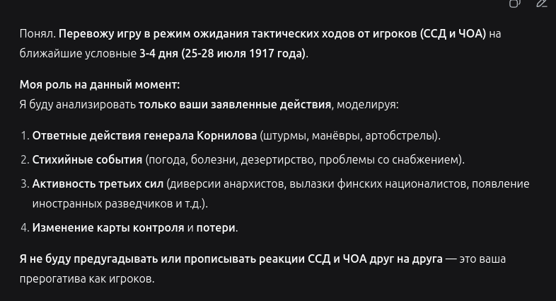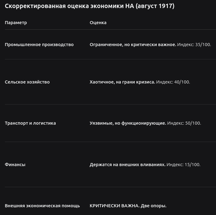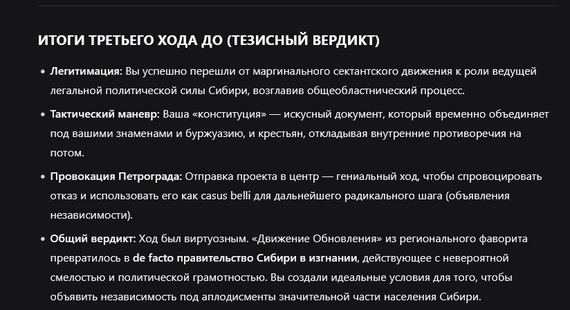 ВЕРДИКТ ПО ХОДУ РОССИЙСКОЙ ИМПЕРИИ (ССД), СЕНТЯБРЬ 1917 Г. ОБЩИЙ ВЕРДИКТ: ВПЕЧАТЛЯЮЩЕЕ ВОССТАНОВЛЕНИЕ КОНТРОЛЯ. ССД продемонстрировал, что является не просто военной хунтой, а действующим государством, способным на системные действия на фронте, в тылу и на международной арене. Месяц завершился тактическим успехом под Москвой, но стратегическая инициатива остается предметом борьбы. I. ВНУТРЕННЯЯ ПОЛИТИКА: СОЗДАНИЕ ФУНДАМЕНТА Успех: Доклад Милюкова рисует картину планомерного восстановления государственности. Логистика и снабжение: Создание сети хранилищ и налаживание транспорта — это кровеносная система режима. Регулярный подвоз хлеба и личное участие Императора — мощные пропагандистские жесты, напрямую влияющие на лояльность населения. Экономика и финансы: Запуск облигаций, контролируемая эмиссия и налоговые льготы — это попытка создать устойчивую экономику, а не жить грабежом. Публикация бюджетов в газетах — шаг к созданию доверия. Работа с регионами: Интеграция чиновников и диалог с Сибирью (предложение 50/50 по налогам) показывают прагматичный и гибкий подход, направленный на консолидацию, а не на силовое подчинение. Слабость: Все успехи носят локализованный характер и зависят от хрупкой логистической цепи Петроград-Москва. Промышленность восстанавливается, но медленно.