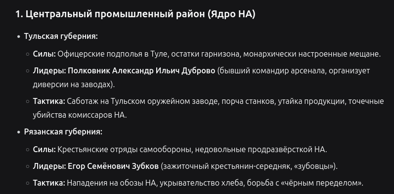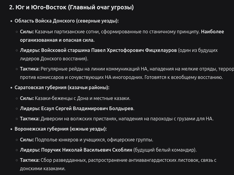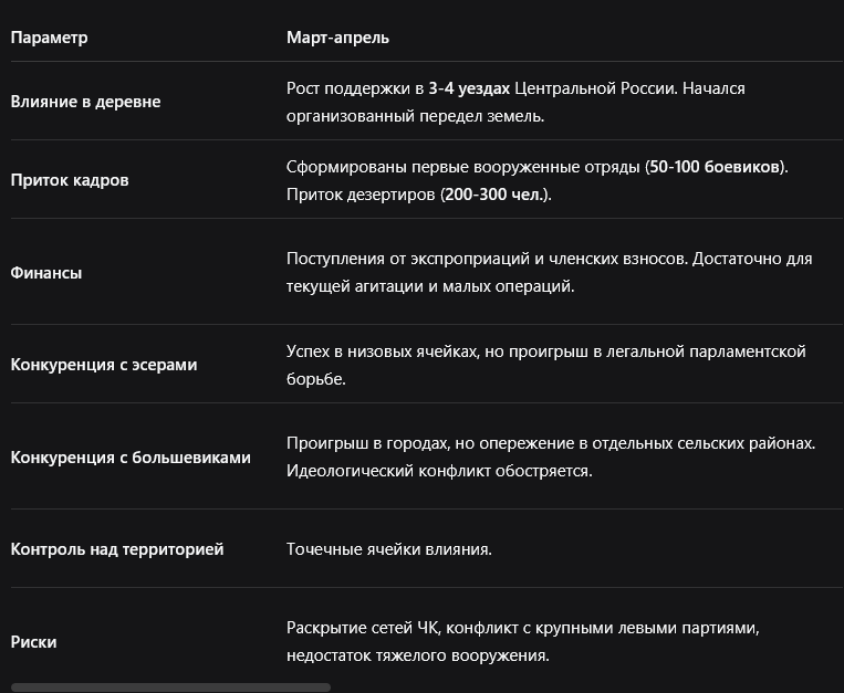 Детальный разбор по пунктам: 1. Сильные стороны и потенциал: Идеологическая ясность и мощь: Лозунг «За Бога, Царя и Отечество» — проверенный, понятный и вызывающий глубинную ностальгию у миллионов. Трактовка отречения как «богоотречения» — гениальный пропагандистский ход, превращающий политику в религиозную войну. Реалистичная социальная база: Опора на офицерство, аристократию и буржуазию — не абстракция. Эти группы были реальными проигравшими после Февраля, обладали ресурсами, связями и горели жаждой реванша. Это надежный тыл. Выдающееся лидерство: Генерал Дорошенко — идеальный лидер для такой организации. Его бэкграунд в разведке и контрразведке — это ключевое преимущество перед всеми другими движениями. Он знает, как работать в тени, вербовать агентов, дезинформировать и наносить точечные удары. Это не кабинетный теоретик, а практик подпольной войны. Дисциплинированные силовые структуры: «Вооруженные дружины из фронтовиков и офицеров» — это качественно иной уровень угрозы, чем «плохо обученные мужики» мартыновцев. Это костяк будущей ударной силы для переворота. Финансирование: Наличие источников («офицерские кассы, тайные пожертвования...») делает движение финансово независимым и способным финансировать террор и агитацию.