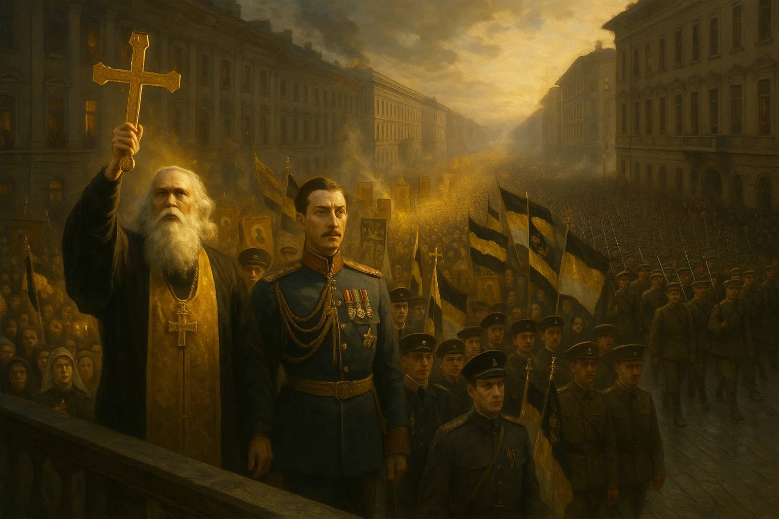 2. Социальная база и поддержка Низовой уровень: фронтовые солдаты и офицеры, фанатичное духовенство, религиозная интеллигенция. Средний уровень: офицерские клубы, православные братства, часть старого чиновничества. Верхний уровень: - крупные промышленники и землевладельцы, разбогатевшие при царизме и боящиеся социализации; - петербургская и московская буржуазия, завязанная на военные заказы и дворянские связи; - представители старой аристократии, потерявшие влияние после Февраля. Ключевые союзники: кадеты и умеренные монархисты (воспринимаются терпимо, но считаются «слабыми»). Враги и конкуренты: большевики, эсеры, меньшевики и весь левый спектр.