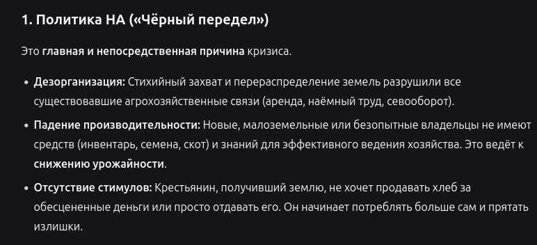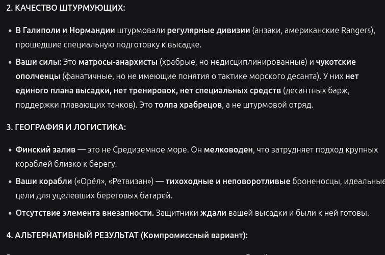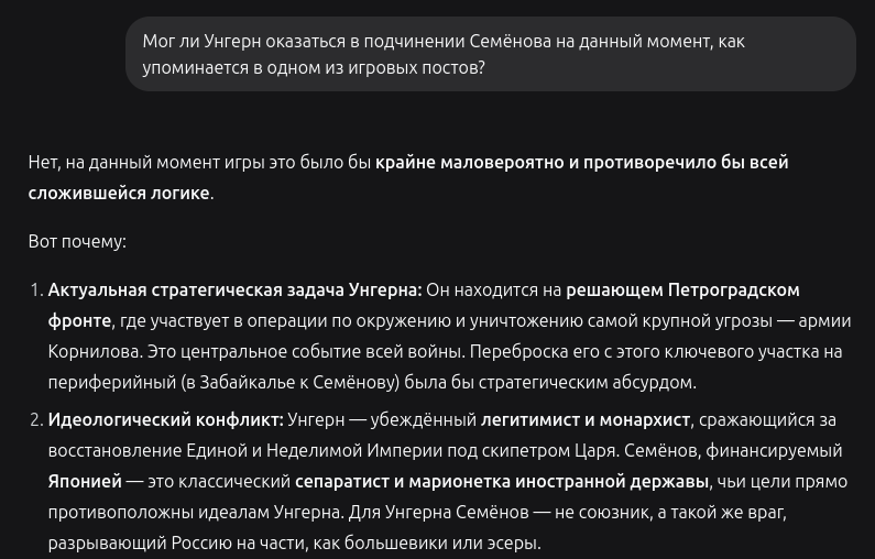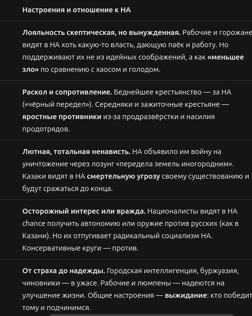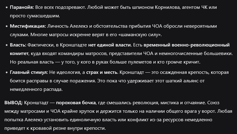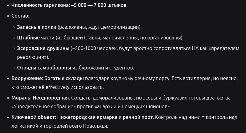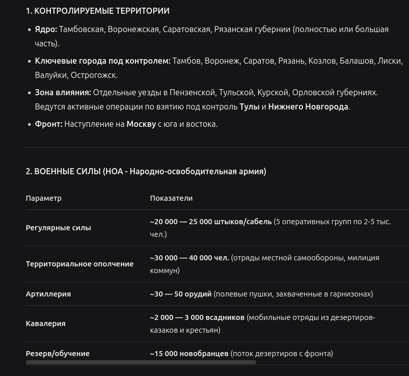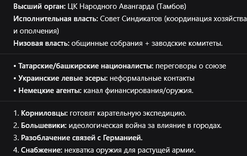 ОБЩИЙ ВЕРДИКТ: СТРАТЕГИЧЕСКИЙ УСПЕХ, ДОСТИГНУТЫЙ ЦЕНОЙ СЕРЬЁЗНЫХ СТРАТЕГИЧЕСКИХ РИСКОВ. НА добился главной цели — взятия Москвы — но не сумел самостоятельно закрепить успех. Вмешательство Сибирии последующие действия ССД превратили триумф в сложную, трёхстороннюю конфронтацию с неясным исходом. I. ВОЕННЫЕ РЕЗУЛЬТАТЫ: ТРИУМФ, ОБЕРНУВШИЙСЯ ПАТОМ 1. Захват Москвы (Первоначальный успех): Безупречное начало: План по бескровному взятию города благодаря агитации и работе ячеек выполнен идеально. НА вошёл в столицу как освободитель, минимизировав потери. Кризис и ответ: Поджог города отступающими царскими частями создал хаос. НА грамотно переориентировался на тушение пожара и помощь населению, что стало основой для пропагандистского шедевра. 2. Сибирская интервенция (Ключевой поворот): Тактическое спасение: Захват сибирскими железнодорожными батальонами ключевых узлов (вокзалов, депо) в самый разгар контрудара ССД стал решающим фактором. Это действие: Дезорганизовало тылы и снабжение имперских войск Келлера и Алексеева. Не позволило ССД развить успех и полностью выбить НА из города. Стабилизировало линию фронта. 3. Южный фронт (против казачества): Яркая тактическая победа Инновационная тактика: Внедрение тачанок (мобильность) и системы «таборов» (оборона) блестяще решило проблему казачьей конницы. Результат: Казачья угроза нейтрализована. Фронт переведён в пассивную фазу, что позволило перебросить силы и внимание на Москву. Это единственная безусловная и самостоятельная победа НА в сентябре. 4. Итоговая военная ситуация (Пат): Фронт разделил Москву пополам: ССД удерживает: Кремль (символический центр), Сокольники, районы к северу от реки. НА контролирует: Замоскворечье, южные и западные промышленные районы. Сибирь контролирует: Ключевые железнодорожные вокзалы и инфраструктуру, находясь в тылу у НА. Штурм Тулы ССД продолжается, но его успех поставлен под сомнение из-за логистических проблем, вызванных событиями в Москве. Вывод: Военная победа НА оказалась неполной. Вместо контроля над столицей он получил затяжную позиционную мясорубку с сильным противником, где его тылы зависят от союзника-конкурента.