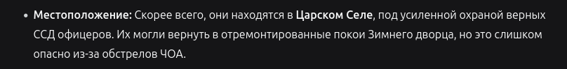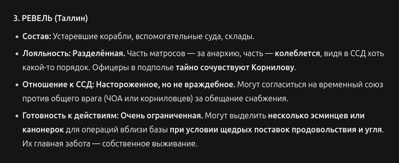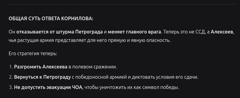 3. Возможности (то, на чем можно сыграть): Корниловский мятеж (август 1917): Это их звездный час. «Союз» может стать тайной ударной силой внутри мятежа, его «стальным каркасом», или же, наоборот, держаться в тени, чтобы сохранить силы после его неизбежного провала (с точки зрения Дорошенко-разведчика, это логичнее). Разложение армии: Чем больше будет хаос и падение дисциплины в армии, тем привлекательнее для многих офицеров будет стальная дисциплина и ясная цель «Союза». Они могут стать магнитом для проигрывающих офицеров. Октябрь 1917 и после: После падения Временного правительства «Союз» мгновенно становится главной силой будущего Белого Движения. Их сеть, кадры и ресурсы — готовый фундамент для Добровольческой армии. Похищение Царя: Вместо террора против левых, точечная спецоперация по освобождению царской семьи из-под ареста в Тобольске силами верных агентов Дорошенко стала бы величайшей пропагандистской победой.