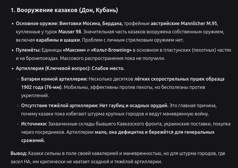 1. Сильные стороны и уникальные возможности: Четкая и мобилизующая идеология. Ислам, особенно в его джихадистской интерпретации, — это готовый идеологический каркас для создания армии и государства. Он дает ответы на все вопросы, определяет врага и обещает награду как в этой жизни, так и в следующей. Это мощнее любой классовой или национальной риторики. Опора на историческую память. Идея правопреемственности от Крымского ханства и связи с Османской империей — мощный мобилизующий фактор для крымских татар. Внешняя поддержка. Помощь оружием, деньгами и, возможно, «добровольцами» со стороны Турции (которая, напомню, является воюющей с Россией стороной) — это значительное преимущество, пока помощь доступна. Это сразу выводит Эмират на уровень значительного регионального игрока. Боевой опыт. Ветераны кавказских и среднеазиатских кампаний — это бесценный кадр для создания профессиональной армии, а не ополчения. Серьезное вооружение. Наличие артиллерии, крейсеров и даже танков (пусть и в единичных количествах) сразу отличает Эмират от партизанских отрядов. Это сила, способная вести не партизанскую, а полномасштабную войну.