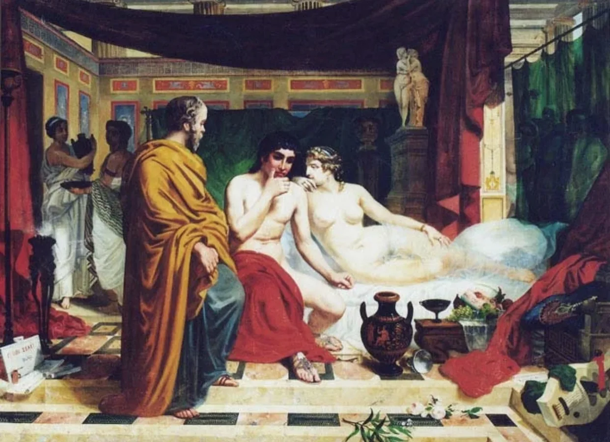 Мужчины, тем временем, залились громким смехом и ударили с Лено по рукам. Первый мужчина лежал небрежно, опершись на подушку. На груди была расстёгнута туника, запястья были в золотых браслетах, глаза масляно-ленивые. Когда рабыня налила ему вина, он сжал её бедро ладонью и с силой провел у нее между ног, усмехнувшись, глядя, как та смущённо опускает глаза. Он ел глазами всё, что двигалось - и определенно был весьма похотлив.
