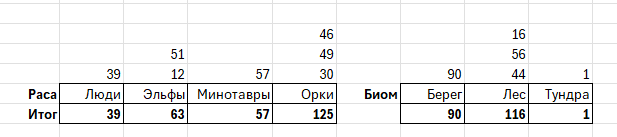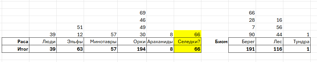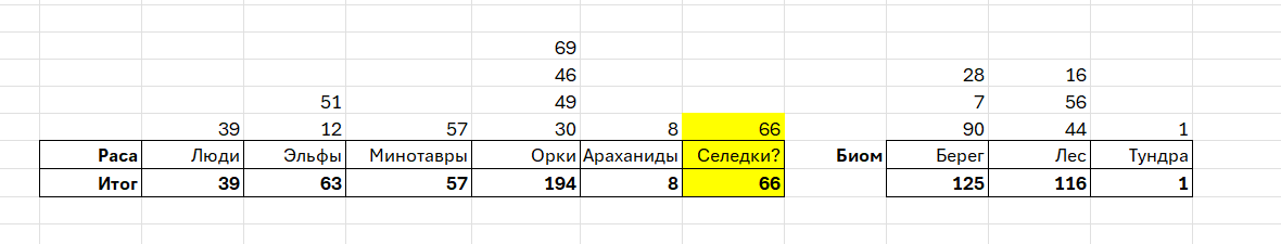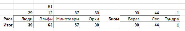 Да, тут ошибка с моей стороны, визирую цифры со второго хода. Распределение по полу или по специализации - согласен, тут можно обсудить. В целом, будто бы определение пола ни на что не влияет, тогда как специальности гораздо важнее. Поэтому в целом можно убрать гендерное и возрастное распределение и оставить только специализации и массу членов племени без оной/базовой специализацией "орк-обывала".