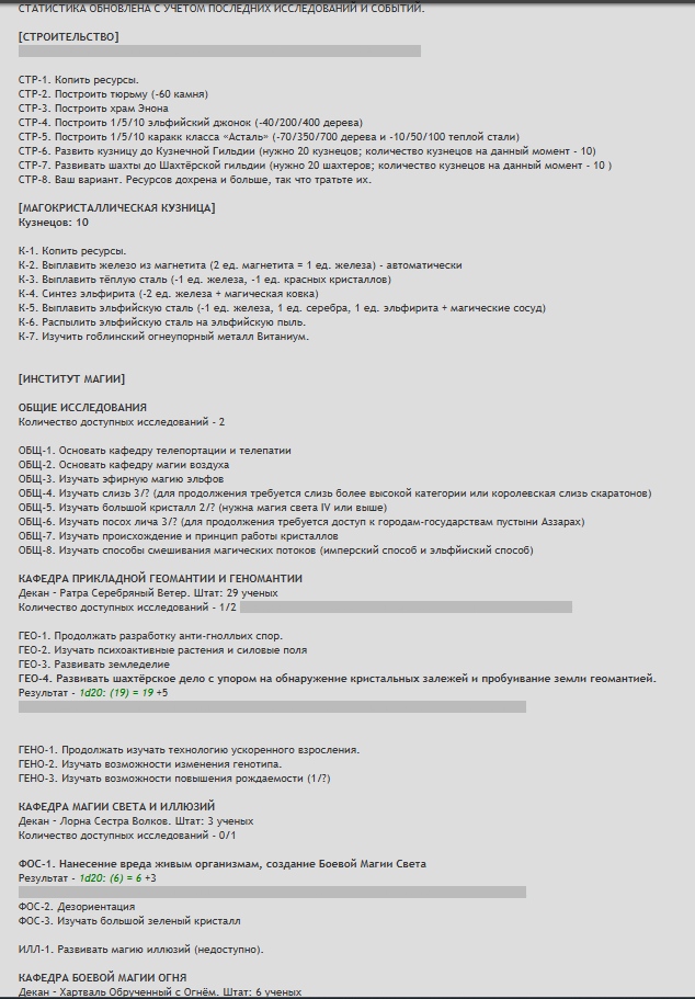 Вообще по техам, магии, проектам, постройкам - это вы все сами можете предлагать. Я что-то со своей стороны прописываю оркам, если либо нецеленаправленное изучение, либо изучение какого-то артефакта.