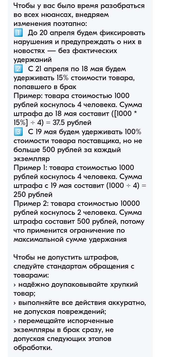 Это на сортировке наверно, да там жопа и легко ошибиться. У меня КАЖДУЮ смену были штрафы, хотя товара было мало (январь) и я особо не торопился. каждую смену от 700 до 2100. 4 смены отработал, получил 5200 и ушел.
