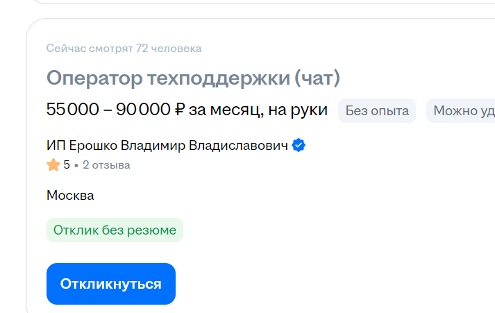 Но да, там поехавший кабан. Хочет техвуз, опыт , навыки, вкладывать не хочет. Хочет как в нулевых дешево бесплатно. В моей мухосрани один только съем жилья 40к-60к