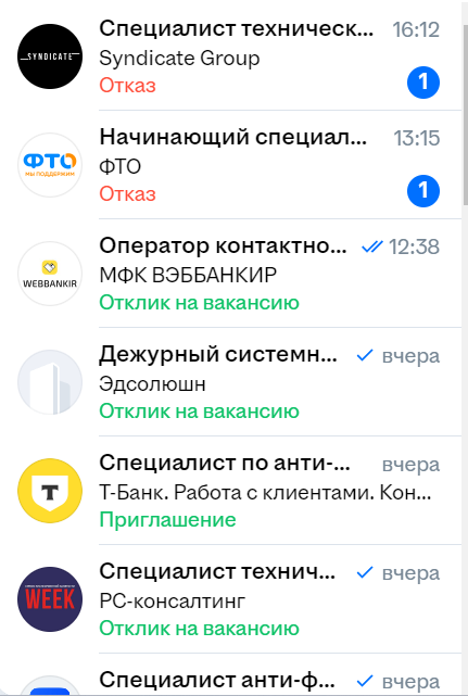 Пока за 2 недели 50 откликов и только 1 выстрелил, ну типа сразу не отказали, кто-то звонил с утра, трубку не поднял, встал в обед, перезвонил, теперь уже мне не поднимают. Подозреваю это сбер, т.к. на хх в это время от них просмотр был.