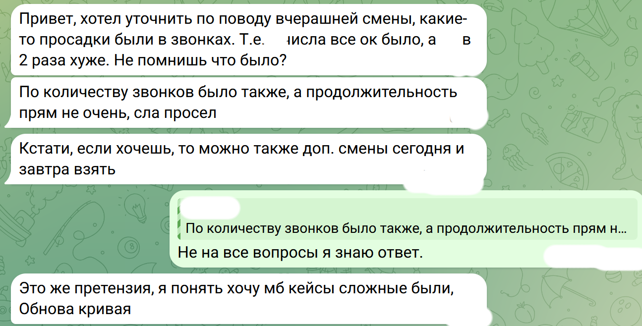 >>3152686 ночью меньше ебки, в среднем 50 звонков. На прошлой смене было 40. Может быть 60 если ты быстро их решаешь. Один ночник сказал, что по его мнению днем меньше звонков, но они могут быть более заебистыми как мне кажется. Большинство вопросов однообразны, если сложный, то все и + 2 линия особо не хочет помогать и раздражается, мне тоже эта хуета не нравится уже бы ушел куда-нибудь, да хуй знает куда. Хотя бы тк здесь, но без дмс.