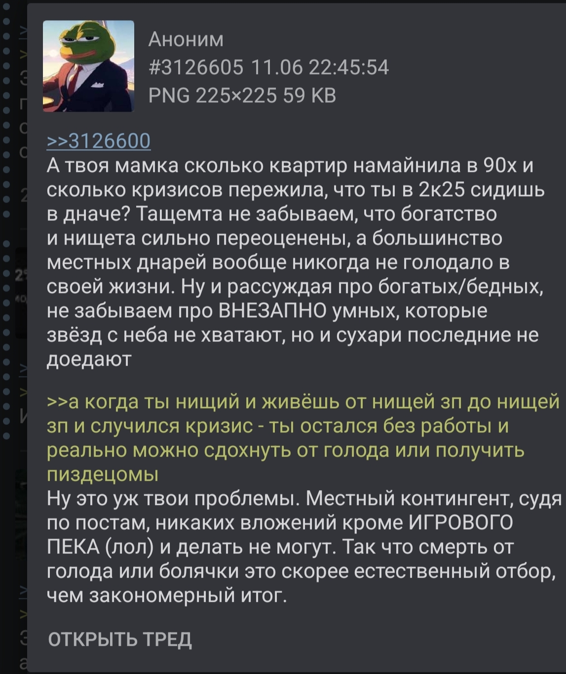 >>3126642 Тут вопрос только лишь в том, что в дначе всегда есть нытики маняпроецирующие свою реальность на других. Тебя послушать, так половина треда сдохле с голода, а другая половина это ты и сдохнет с голода завтра. Кто ж тогда каждый тред успешно вкатывается в айти и не знает как выживать на 3 бабкины хаты и 50к за работу дворником?