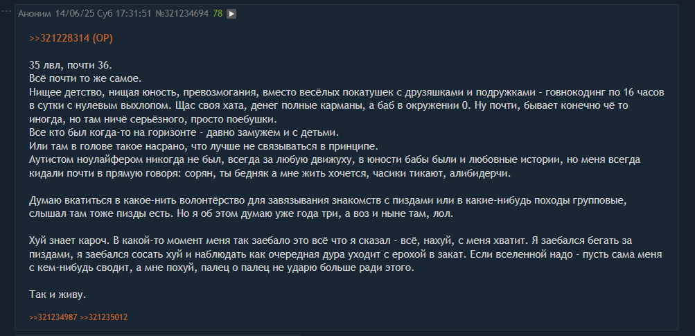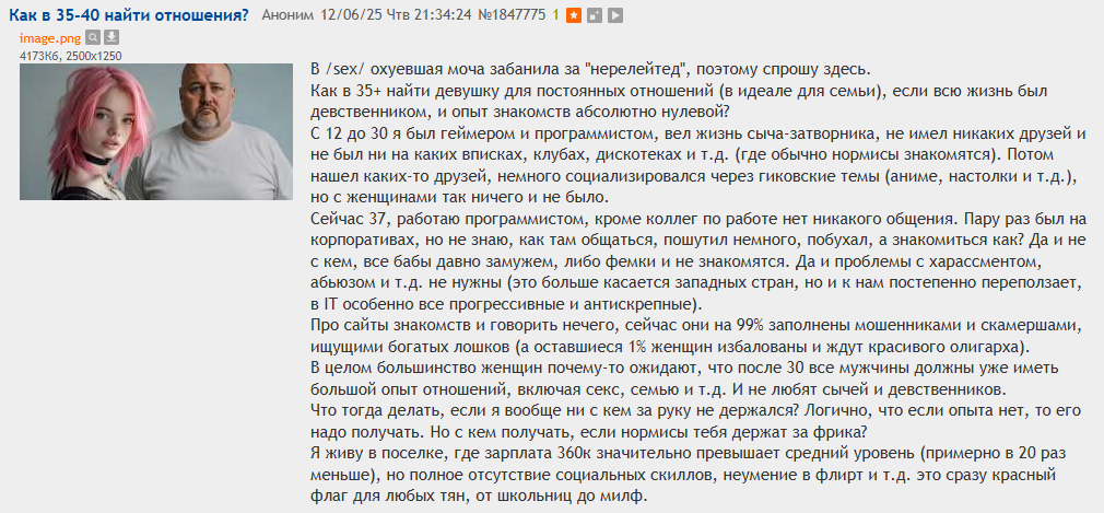 Нет, никогда я не смог понять, как можно одновременно быть богатеем с зп в 360к в месяц (я за всю жизнь столько не накопил), и одновременно жалкой тряпкой, сокрушающейся что "нет тяночки"
