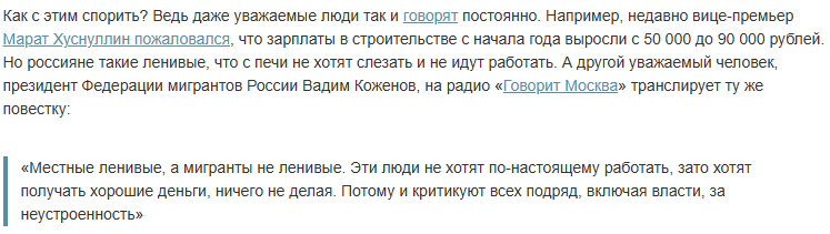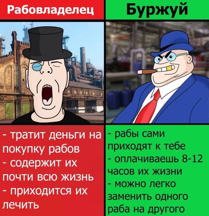 Читал книжку как-то раз. Там сюжет вот такой был. Двух долбоебов продали в рабство. Там они познакомились с ещё одним долбоебов. Их всех послали копать канал. Ну копают они, копают, день, два. Тут третий им говорит: - Чёт фуфлыжно как-то мы тут сидим, если так будем копать по 12 часов скоро коней двинем. Надо бунд поднимать Второй отвечает: - Нет, бунд это не выход, я бухтеть не буду, а лучше буду трудиться по 16 часов в сутки, чтобы надсмотрщик за рабами заметил моё усердие и перевёл на другую работу А первый им говорит: - Бляяя ну хуй знает короче я за вами посмотрю, кто к успеху придёт, за тем и повторю На следующий день тот чел устроил бунд и всех отпиздили. Тех двоих забрали куда-то и первый чел не знал чё делать. В итоге он решил не бухтеть, а работать дальше по 12 часов. Через полгода на строительство канала приехал второй чел со своим новым хозяином. Он теперь работал на лёгкой работе. И пропагандировал этот подход тому челу. - Как же ты смог выбраться отсюда? - Когда всех отпиздили после бунда, надсмотрщик не стал меня убивать. Он сказал, что я хороший раб, и нельзя убивать такого хорошего раба. Поэтому он продал меня другому хозяину. А на базаре я тоже всем рассказывал, какой я хороший раб и меня купил добрый хозяин, который хорошо ко мне относится. - А того чела убили? - Если бы. Его продали работать на строительство городских стен и он каждый день носит камни снизу наверх и будет так делать, пока его спина не сломается, затем его труп замуруют в стену.