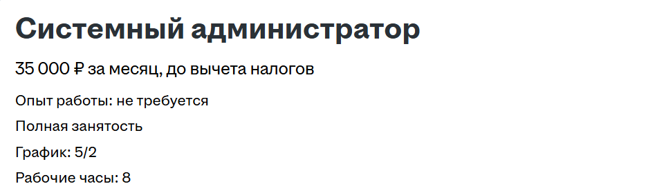 Или, например, я сейчас устроился сисадмином на 450к на руки, но у меня обязанностей вагон так как это интегратор. Планирую через полгодика развести, чтобы оформили старший сис.админ или девопс, или архитектор так как проектирование инфраструктуры тоже входит в мои обязанности, но пока это уровень мини офиса.