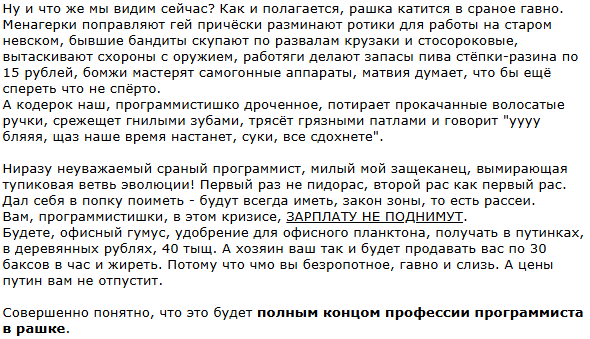 Бля вы только подумайте пацаны. Мы "волчим" на какие-то жалкие 50к срублей нахуй. Мы реально унижаемся, потеем, виляем жопой, преклоняемся - лишь бы взял Барен на целых $500/mon. Внатуре ебать, пока условный Джон дворником лутает в 5 раз больше, мы учим, дрочим, падаем ниц ради $500. Как же мир жесток!!