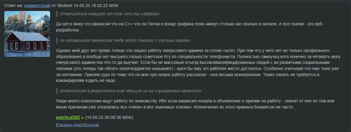 >>3117793 Я тогда перекатился из физика в сисадмина. Для физика работы не было кроме преподавания, а мне не зашло это. Первая тряска работа в качестве техпода на офис примерно 40 человек. Там даже серверов не было, компы + плоттеры(проектная компания). Тогда Директор попросил переустановить Винду на личном ноуте но чтобы все доки сохранились. Потом ещё раз, потом ещё несколько раз. Я на 4 раз взял и снёс ему все и накатил чистую Винду. Он орал матом как бешеный но мне было похуй. Типа там доки снеслись, ЭЦП + бд от 1С. Он просто меня заебал тогда. Потом успокоился, нашел копии документов где то на флешке. Я вскоре оттуда ушел, но понял что нечего бояться. Вникаешь, а потом автоматом все идёт. Сейчас благо нейросети есть, подскажут нехуже ментора. Да даже если закрытая система, то полазиешь в ней, поковыряешь и разберёшься.