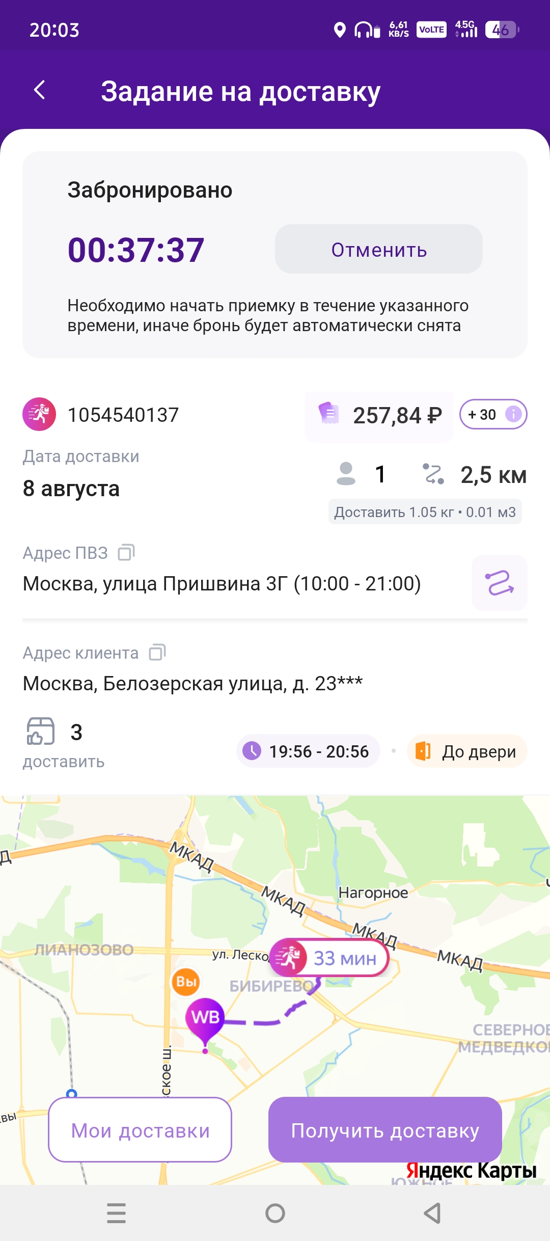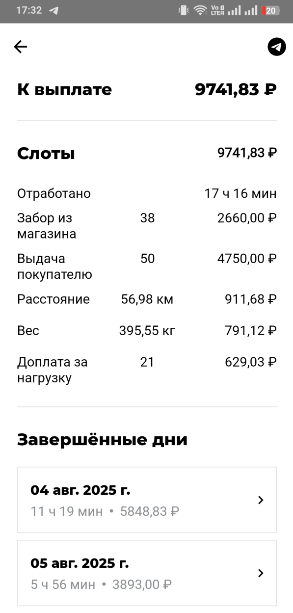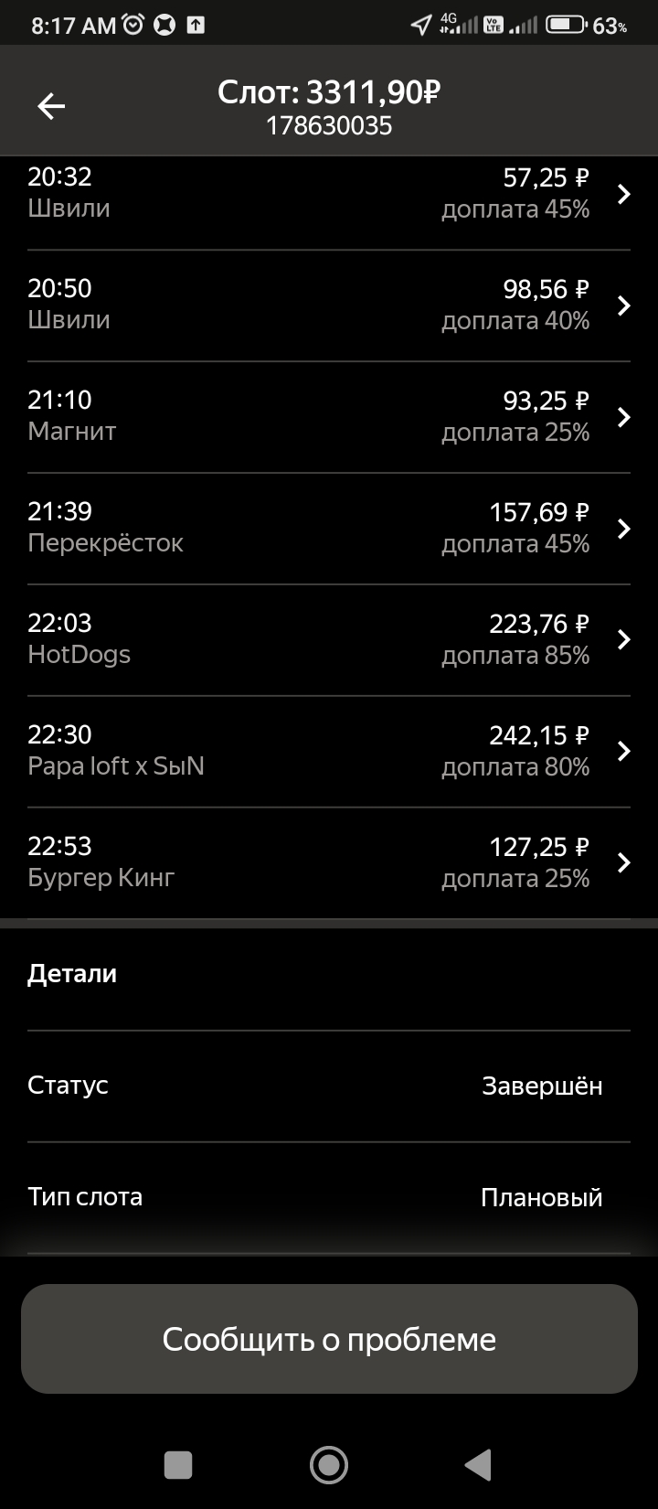 >>3137778 Всё те же 200р в час, +/-. После последнего заказа слота посидел помониторил заказ по пути домой, вообще это конечно тупо что нельзя до окончания слота это делать. Заодно чуть экспанулся в ручном наборе. В общем нашёл один, приехал на первую точку, а там выяснилось что заказ надо было забрать до 15:30, а в инфе заказа этого нет. Минут 40 минусанул за компенсацию в сотку, ну хоть не 0. Хотел уже в холостую ехать домой, как на остановке в 3 минутах появился заказ почти до дома, повезло.