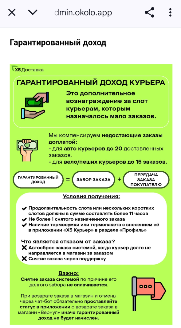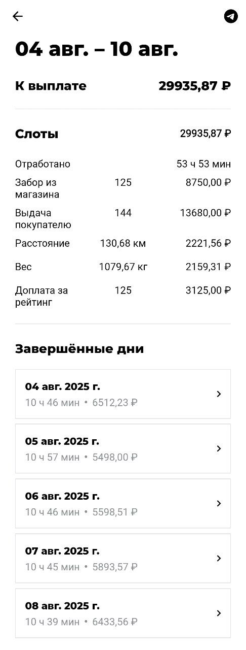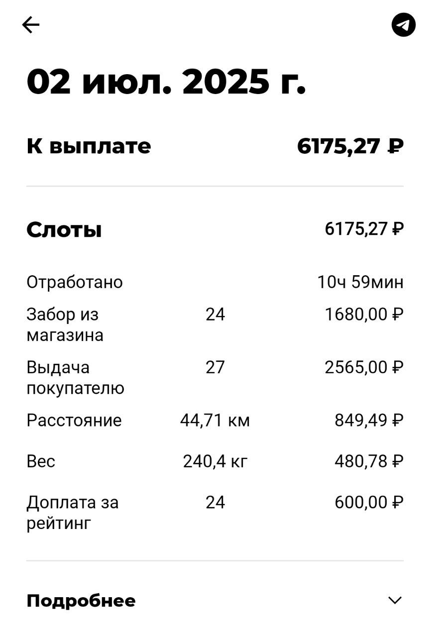 >>3158118 Стоимость заказа формируется из забора из магаза 70р + выдачи 95р + 2р/кг за вес и 16-22р/км за пробег (зависит от вело/авто). Это для ДС и поддсья Количество как повезет и смотря где ты и на каком статусе и как быстро заказы будут собираться. Я на тачке из даркстора делал 20зз за 12ч слот, в другом районе из перекрестка 35зз. В сезон можно и 50 в день Фиксы нет, есть гарантия для 12ч слотов , там доплачивают до 15/20зз (вело/авто) если их меньше Слоты выкатывают для всех во вторник, кто первым забрал тот и работает Если слотов нет, выходишь на свободный слот, биржа называется. И тебе прилетают заказы со всех магазов около тебя Заказы назначает прога Из минусов тяжести приходится таскать, особенно на автостатусе и условия за лето ухудшились - порезали таймеры, ввели подмену номеров клиентов, проверку прибытия через номера готовых заказов, кур стало многовато