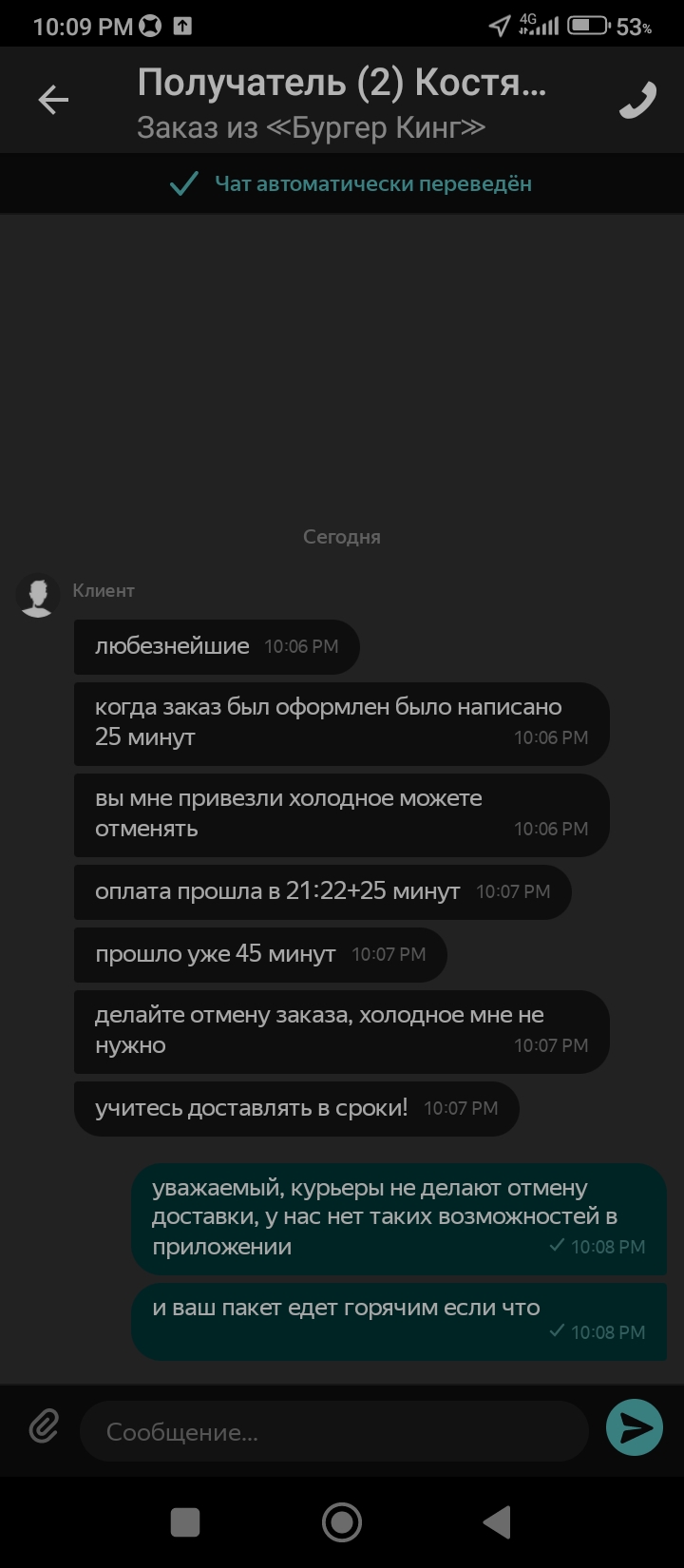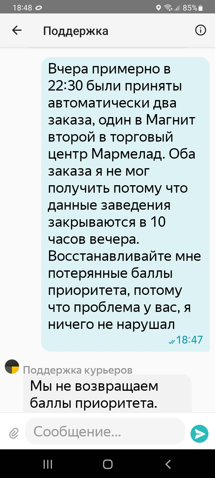 Служба поддержки мне звонит спрашивает когда смогу доставить еду, я отвечаю что мне тут попался второй заказ и я в очереди жду в пункте приёма доставки, она говорит хорошо