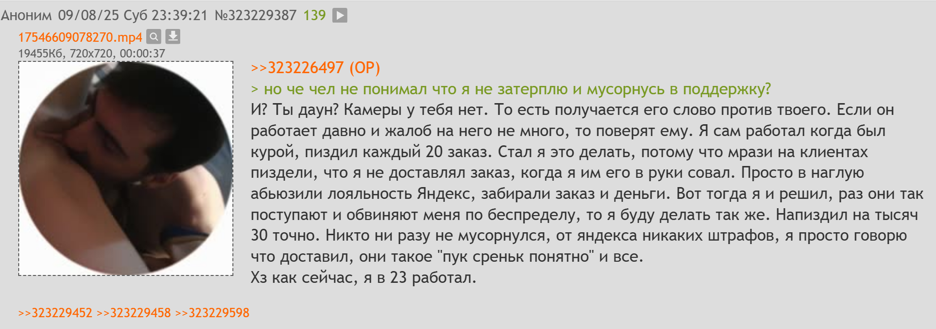Пиздец сегодня выбесили конкуренты, суки, я после 20.00 ни одного заказа не взял, твари. Ебал я в рот работать за сраную 20 ку в неделю . я даже не помню, брал ли я вых, или были дожди. Опять мне кто-то испортил рейтинг на 1 бал, суки. Наверняка мразь с 22 пвз, которая собиралась закурить , а я ей не дал. Буду я ещё ждать , пока она раскуриться. Как же я ненавижу курящих баб и дым от сигарет. Или кто-то из клиентов, а ставить еще более старую версию ради отзывов я не хочу, но, сука, интересно, что не так. Кружки с постоплатой ебань, взял такой, начались проверки товара, нахуй, я их скипал, но их все больше и больше становится, с так, списываешь через прогу, но это все время пока интернет расчехлится. Обычно заранее открываю скан, фрапсю и сваливаю в лифт, пока он не закрылся.