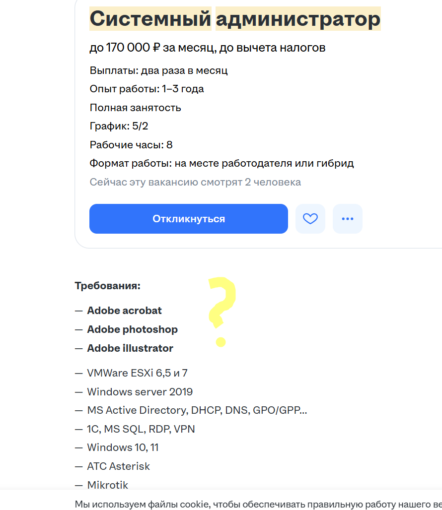 Что делать, если я вроде макака-эникей L1, но мне падают задачи с комментариями от начальства "делой блджад" уровня развернуть и настроить астер+фрипбх с нуляки для целой дочерней фирмы, напердолить бд, веб сервера, бесконечные миграции 1с, скрипты просят писать часто, почтарь, ад, фс и так далее чинить/разворачивать. Я просто недавно почитал свой список обязанностей на зп в 60к и оказалось, что все перечисленным L2-3 занимается а у нас в конторе они есть по 4 микрочела на каждую линию. Аноны, поскажите, меня реально скамят на деньги и катаются на моем энтузиазме или все ок?