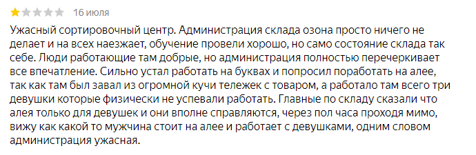 Отписывался в теме до перекатов. Тогда я отработал 5 смен на озоне в Екатеринбурге на подборе.Вышло в среднем около 3000р на руки за 12-часовую смену( после вычета 13% налога). С тех пор отработал еще смен 20, производительность выросла до 80-90% от ожидаемого дохода. Но я перестал брать смены по 12 часов, беру по 8 часов. Двенадцать часов моя нервная система в этой помойке не выдерживает, особенно когда смена неудачная, например отправили собирать в зону, где давно не проводили инвентаризацию и кучу времени тратишь на поиск "потеряшек". С месяц назад у нас поменяли систему оплаты нон-сорта, и теперь собирать его стало выгодно.Нужно ли говорить, что теперь он мне практически не выпадает...Хотя раньше по полдня ходил и матерился, собирая тяжелое барахло. Это я о "случайном" распределении заданий... Ввели штрафы за беспорядок, избежать которых невозможно.По сути ,также как с браком, платишь за косяки других людей.Каждую смену стабильно 2 штрафа по 150р. Штрафы за брак,кстати, стали ощутимей, раньше прилетало по 20-30-50р. Сейчас может прилететь 3 по 150. Складывается впечатление, что у них есть некий лимит на оплату джобовцев,некая сумма в день например.. и если они из него выбиваются, то срезают выплаты за счет этих самых "штрафов". Сейчас каждая смена у меня начинается не с зарабатывания денег,а с отработки штрафов. И все-таки,если работать регулярно, зарплата сейчас выходит выше средней зарплаты кладовщика в Екб. Но работать нужно очень интенсивно, наверняка можно найти место с такой-же зп и нагрузками в разы ниже. Да и тенденция со штрафами наметилась нехорошая...