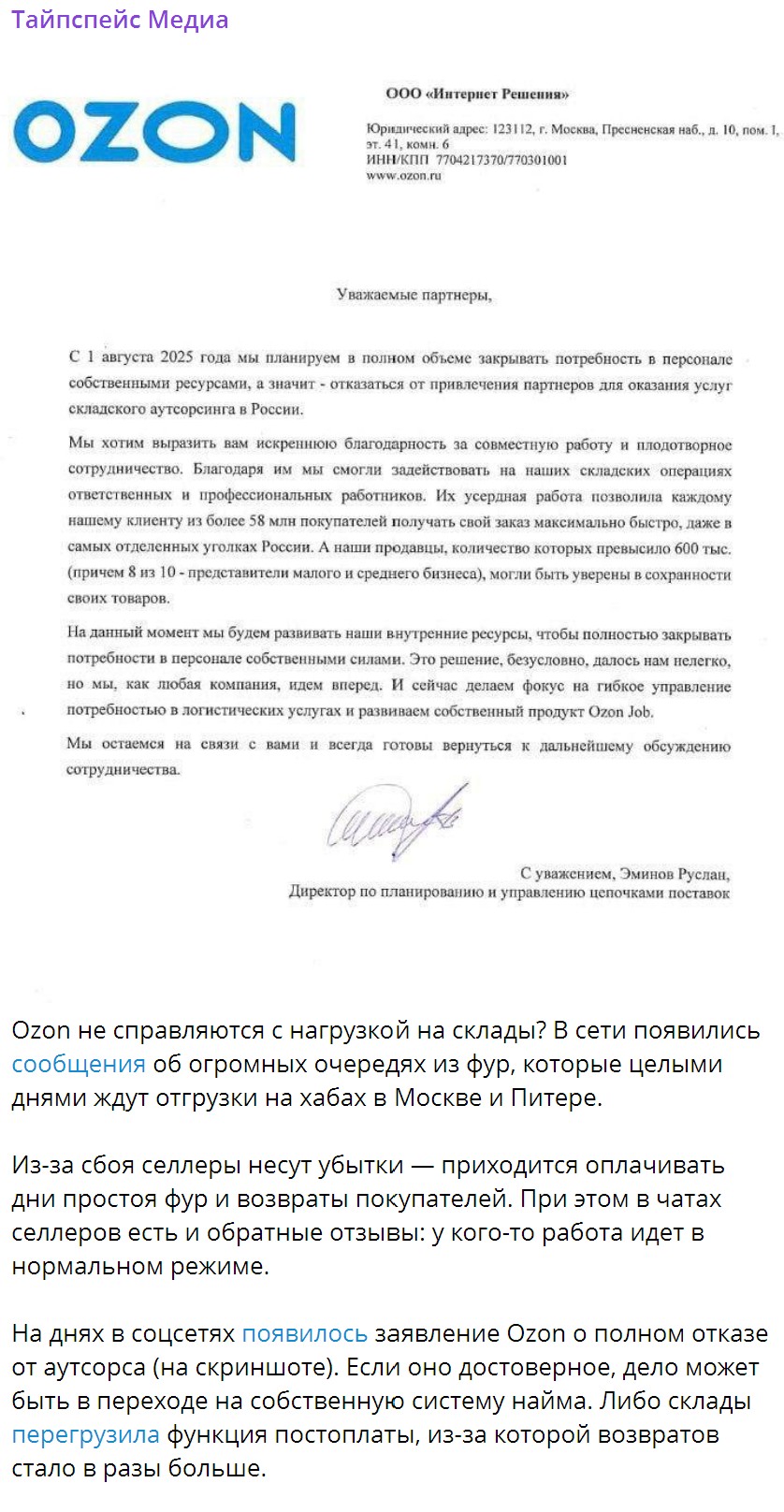 >>3164439 >>3164440 Там по логистике начальника всего озона сменили, прошлый обосрался за 6 месяцев, вот новый говно которое он нахуевертил разгребает - пока безуспешно. Все СМИ сегодня об озоне пишут, на днях BAZA опубликует расследование про озон.