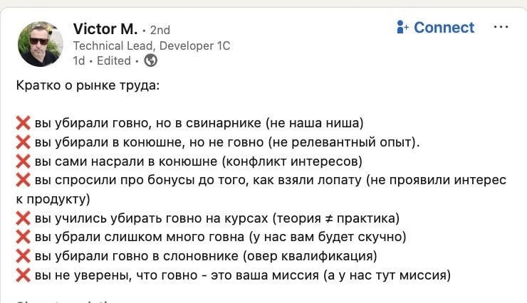 Скок я до этого искал работу - везде говно, где-то более, где-то менее, с норм мест не уходят, либо уходят редко...