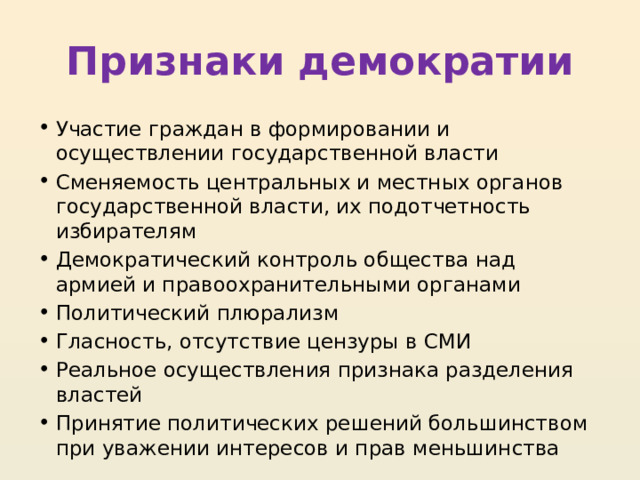 >>3239900 Ну, что такое федерация ты можешь сам почитать. Но по факту у тебя слишком централизована власть в москве. Что в федерации должно решаться на местном уровне и быть в полномочии региона-области, то давно уже отняли. Самый наглядный пример - отсутствие выбора мэров и губернаторов, просто каких-то чушланов присылают с москвы которым похуй+поебать на регион и они не местные вообще. С демократией тоже все просто - посмотри на признаки демократии и попробуй найти хотя бы несколько, которым отвечает современная рыфы.