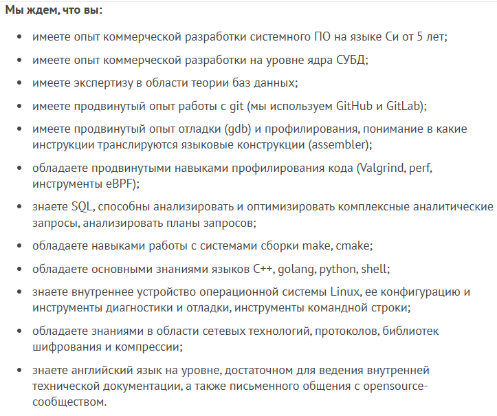 >>3144433 Ты видел те компютеры? Как только появились нормальные, все тут же пересели на 286-е. >>3144432 Судя по вакансии, нужно разрабатывать/дорабатывать СУБД. Список требований в целом нормальный для системного разработчика.
