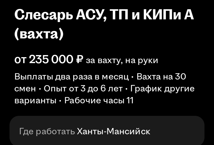 >>3190375 Во-первых, с улицы никого не берут. Нужна либо нефтевышка либо опыт в нефтянке. Во-вторых требуют очень специфические навыки работы со специфическим нефтегазовым оборудованием. Такие не получишь если всю жизнь ПНРил пищёвку или даже химичку. В-третьих, в нефтянке собран весь хайтек. Даже не понятно кто хайтечнее: нефтянка или атомка. Поэтому тебя на собесе спросят о чем-то типа "Был ли у вас опыт реализации тройного кольца резервирования на шлюзах последняя_модель_нэйм в рамках проекта на 300 таких шлюзов по всей стране?" И в-четвертых, нужно ехать в холодные полярные ебеня, где холодно, крайне хуёвая связь, еда запредельно дорогая, пидораший_загон.вебм итд итп.