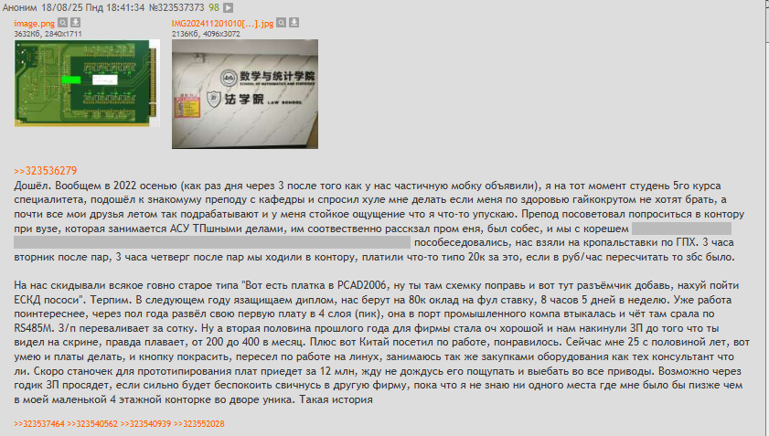 >>3160129 Во-первых, для меня и 60к белыми - хорошие деньги, а тут и 80-100к предлагают. К тому же даже в моей мухосрани и ее области есть парочка заводов с открытыми вакансиями. Во-вторых, в "модном" айти меня интересует только тестирование и дата-аналитика, а по этим направлениям рынок перегрет. Эникейство/сисадминство же пахнет пыльными офисными хуями и я не хотел бы этим заниматься всю жизнь. В-третьих, я проебланил в универе разработку для ПЛИС, а сейчас дошло, что это направление было одним из немногих среди преподаваемых, что мне могло зайти - даташиты читать, байтоебством заниматься и пр. Что-то подсказывает, что АСУ не так далеко от этой темы должно быть.
