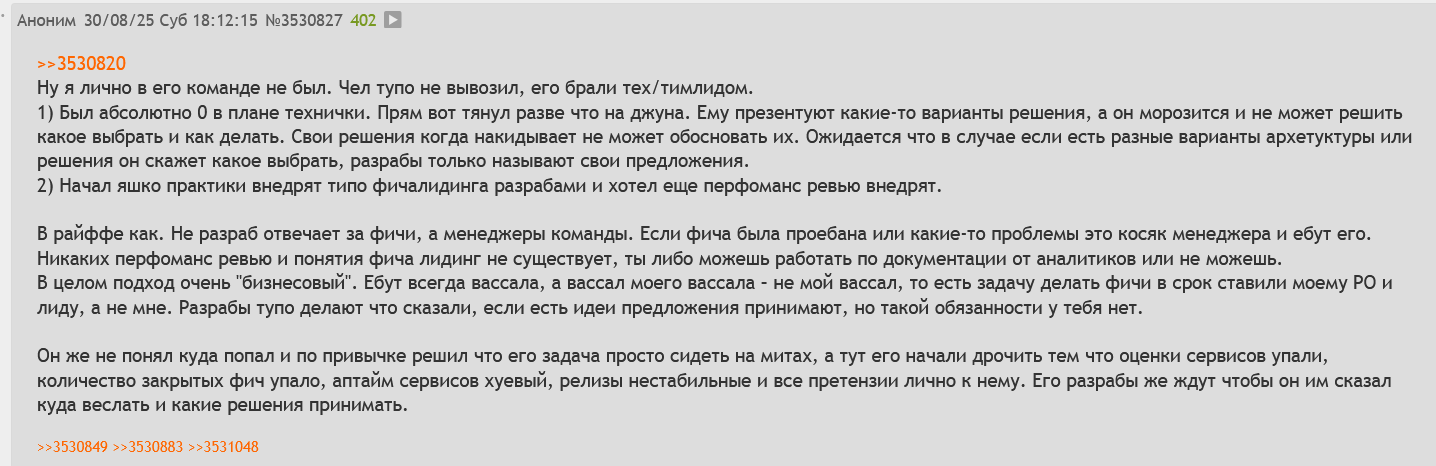 Тимлиды это отдельная боль, не умеют вообще инструкции пошагово простым языком писать, тупо не могут. Пример, сделай пункт 1-7, либо делай по шаблону 2, а далее по пункту 6 из шаблона 1, но в пункте 6, три подпункта. Вопрос применять весь 6-й пункт из шаблона или только конкретный. Указываю на это, огрызаются, что тут ребенок даже разберется, я прошу детально, мне минус кидают, мол на ревью не будет повышение ты не тянешь. Да похуй на повышение, я работаю с бабками, мне надо точно понимать до момента, когда сделаю действие.