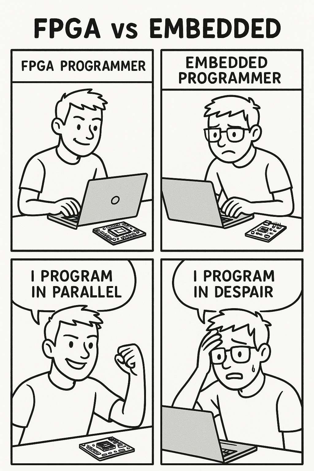 >>3192418 FPGA это проектирование цифровой логики кастомного процессора, где набор команд выполняется в один такт, всегда паралельно и всегда за одинаковое количество времени.