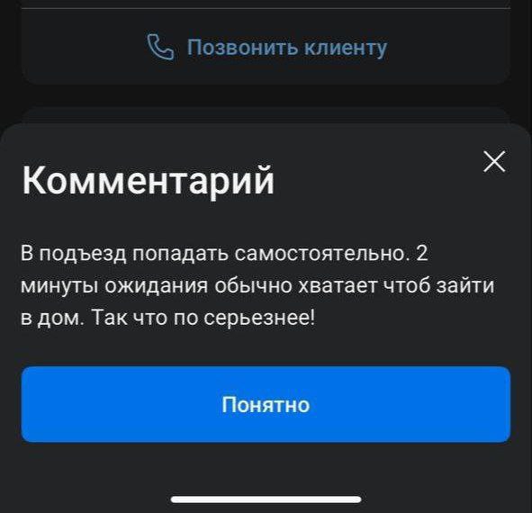 Ещё отнёс заказ, его другой курьер носил два раза и не донёс до клиента. Звоню с пвз, уточняю адрес. Нихуя не слышно почти, ну вроде там кто-то говорит, что принять заказ может. Иду до дома. Домофон не берут, но мне открывают дверь жители дома. Поднимаюсь на этаж - там закрытая тамбурная дверь, звонков нет. Пока пишу смс на номер клиента - приходит соседка с ключами. Фортануло. Звоню в квартиру - там бабулька, говорит, что домофон не звонил. Показывает на бумажку на которой написан код клиента. Бумер момент.