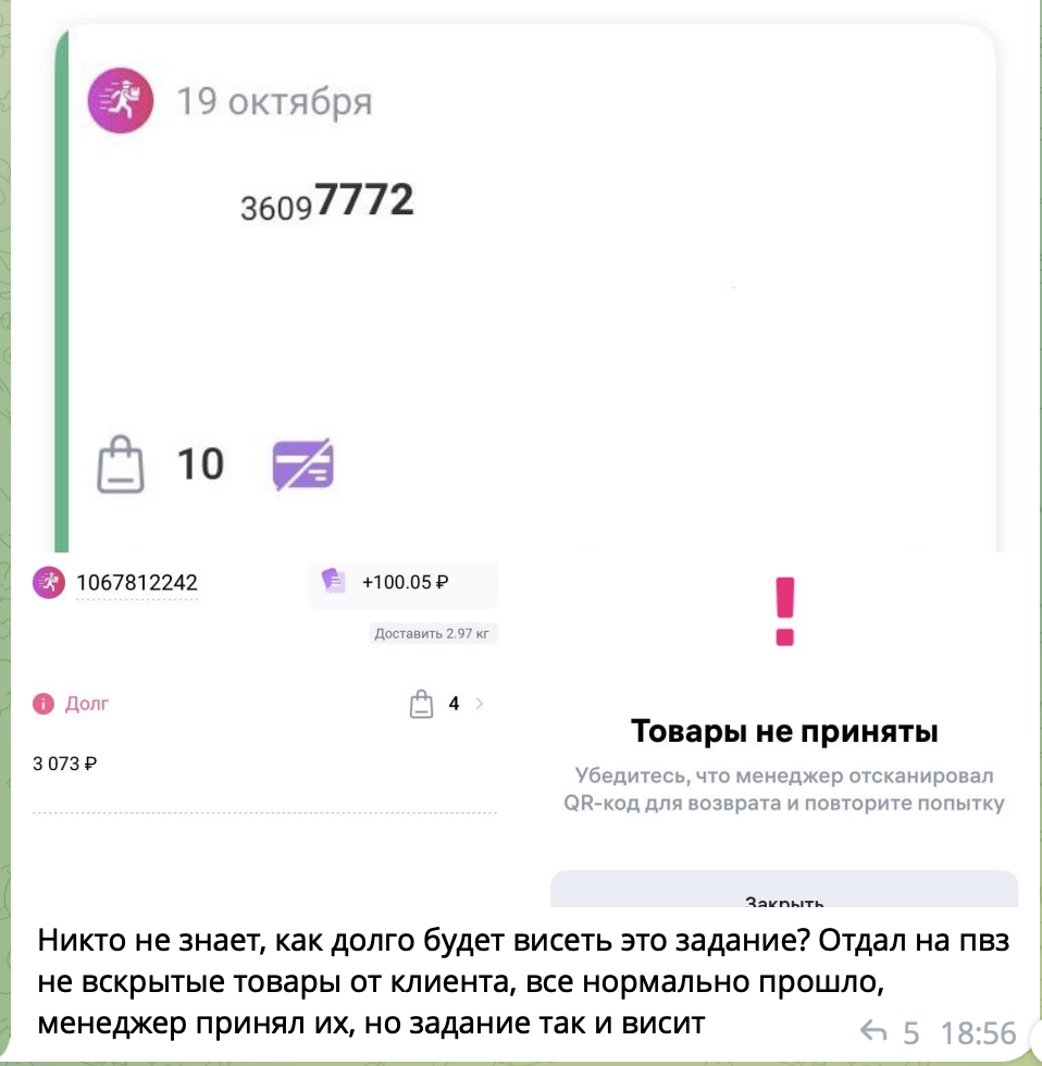 >>3209505 >29 если за 40 минут успел да >А возврат оплачивают? Если ты ввел код, то за возврат дадут бонусом до 30р. Если до клиента не дозвониться, придется возвращать на пвз забесплатно весь заказ, за него не заплатят вообще. > А лимит времени на примерку? Наглые блядины все-таки читают что им пишут в приложухе, 10 минут на примерку, и сразу об этом заявляют. >В смысле? Ты передал клиенту все его дилдаки "оставить у двери". Могут быть клиенты наебщики или просто тупые пидорашки решившие в своем свинарнике с соседями пидорасами выбрать данную опцию, а отдуваться курьеру >пакетные В основном ёмкие заказы с отрезком времени в целый день, в определенный момент есть шанс не застать клиента