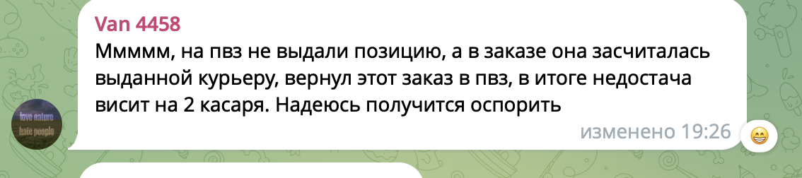 >>3197720 было такое, телка на ПВЗ должна нажать еще при выдаче что товар не найден и покупашка увидит в приложухе, что оплату за этот товар с него не возьмут даже если была предоплата