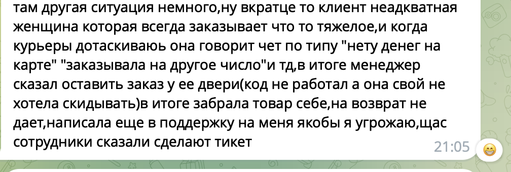 Из интересных взаимодействий - иду на постоплату, она за км находится. Прихожу, а тёлки, которая заказывала, нет. Вместо неё её подруга. Они подбухивали, клиент закала вб и забыв об этом ушла домой. Пока ждали код, мне предложили пожрать голубцов, ну я скипнул, типа работать нужно.