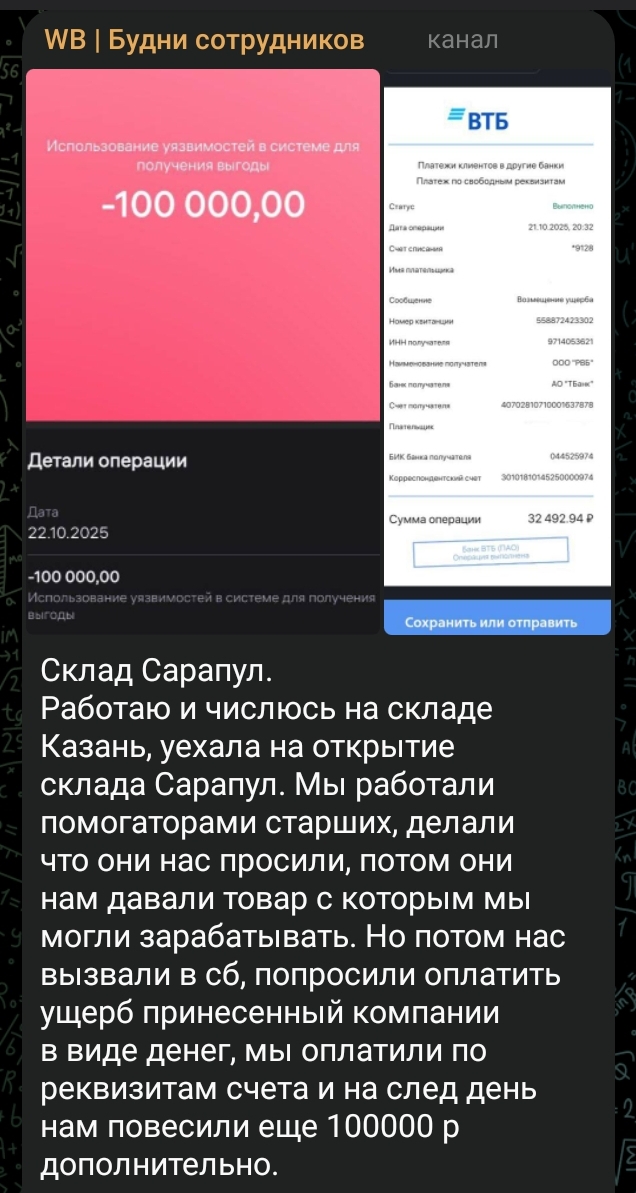 Любопытную историю с вб нашёл. Типа мазанные пришли на склад, сначала выполняли какую-то работу шестерок старших, потом им старшие давали халявный товар, где они легко могли напикать достойную сумму за пару часов. В итоге нагнули. Интересно только, старших тоже там поимели за то что давали халяву или все шишки достались работягам? Впрочем, скорее всего их с должности сняли и может тоже штрафов выдали.