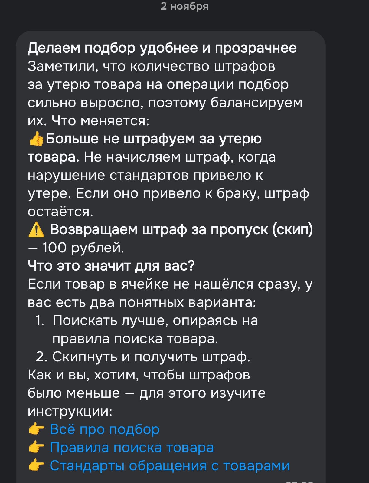 >>3209004 Что выгодно? Платить по 100р вместо старых 20р? Типа смотри, сначала было 20р. Потом 20р они убрали и стали присылать тебе разделения по 150р. Уже забыл какие там точные условия, но типа ты скипаешь товар, если через ~3 дня его никто не находит, то тебе прилетает разделение за него, как "нарушение обращения с товаром" рублей на 150,иногда меньше, если вещь совсем копейки стоила. Теперь тебе за скип не будет спустя 3 дня начисляться "нарушение обращения" на 150р, а будет просто сразу 100р прилетать. Ну ладно, считай на 50р стало "лучше". И на 80р стало хуже, чем было изначально. А, размещенцам теперь тоже будет по 100р лететь, если их вещь числилась в одной ячейке, а лежит в другой. Как это проверять будут - не знаю, я там не работаю. Но вроде раньше у них такой штраф 10р стоил. И не упусти ещё такой момент, что максимальная сумма за брак теперь 500р. Хотя раньше она вроде не превышала 150р. Это все при том, что озон иной раз крайне засран и люди только в олном задании делают по 10 скипов, уже -1к рублей. А за весь день итого больше скипов насобирвют.