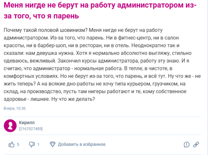 >>3216290 Я указала пол не с целью вниманиеблядства, а чтобы если могли мне посоветовали работу учитывая пол, ну типа фрезеровщиком каким-то я же не пойду, я даже не знаю что это, как и грузчиком, охранником кунов берут в основном, я откликалась на вакансию работника склада в магазине одежды вроде там не тяжело, мне сказали берут кунов только, а мне предложили продавать в зале торговом